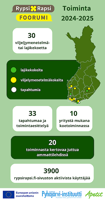 RypsiRapsi-foorumin toisen toimintavuoden aikana on jatkettu keväällä 2024 rahoituspäätöksen saaneen Rypsin ja rapsin viljelyvarmuuden ja -määrän lisääminen – VARPSI -hankkeen toteutusta. Hankkeen myötä foorumin viljelymenetelmä- ja lajikekokeiden määrä on pystytty kaksinkertaistamaan edelliseen vuoteen nähden.